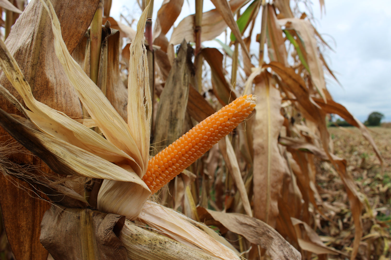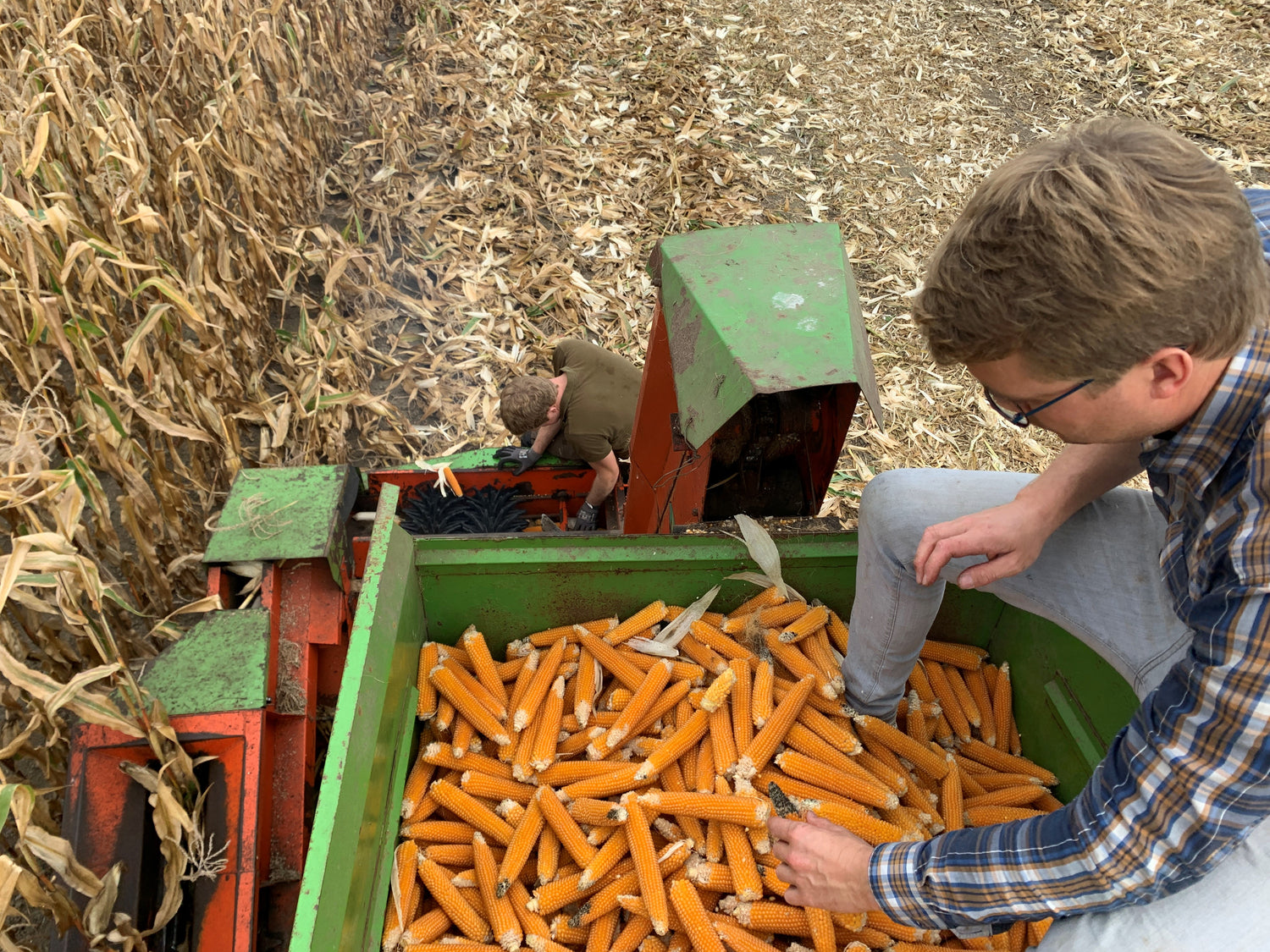 Der Popcornmais ist im Herbst reif und kann geerntet werden. Die Ernte ist jedes Jahr gemeinschaftlich und traditionell gestaltet. Der Maiskolben wird mithilfe eines besonderen Maispflückers von der Restpflanze entfernt und in einem Bunker zwischengelagert bevor er das Feld verlässt.